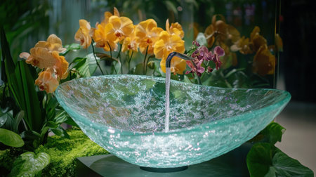 A stunning luxury sink with crystal-clear water running, surrounded by vibrant flowers in an elegant and artistic bathroom setting.