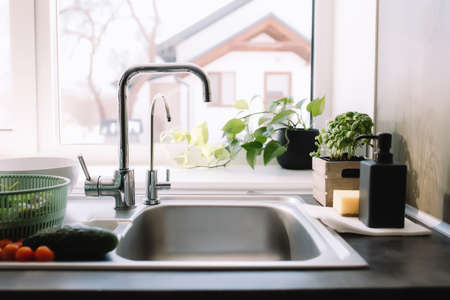 Blurred kitchen interior with black tap, white sink, green plant, water tap and faucet