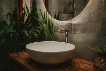 Discover a contemporary bathroom featuring an elegant white wash basin, sleek faucet, and natural elements, creating a serene and stylish atmosphere.