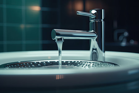 Generative AI Close-up of a smart touchless kitchen faucet, LED-lit water stream, metallic surface details, sleek tech design, photorealistic depiction