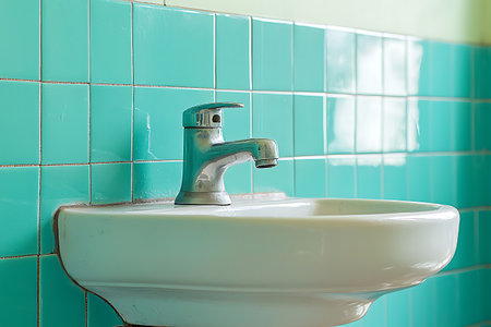 A sleek bathroom sink featuring a chrome faucet against a vibrant turquoise tile backdrop, ideal for modern interior designs.