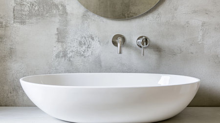 A modern white sink features a shiny faucet with water running, creating a serene atmosphere. Ideal for showcasing contemporary bathroom design and cleanliness.