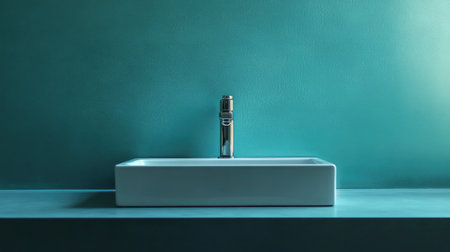 A stylish minimalist bathroom sink with a modern faucet set against a rich teal background. This image reflects contemporary design ideals and aesthetic simplicity.