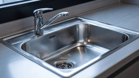 Clean shiny kitchen sink with no clutter and polished chrome faucet