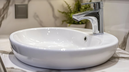 Close-up of a white ceramic sink with a modern faucet in the bathroom.