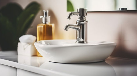 The Power of Cleanliness, Hand Washing Illustrated with a Soap Dispenser on a Bathroom Washstand. Generative AI