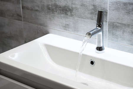 Modern bathroom faucet. Flowing water from water tap, copy space.