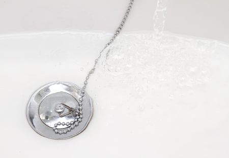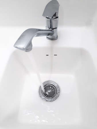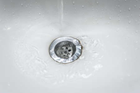 Closeup of tap water flowing into stainless steel drain of white washbasin background
