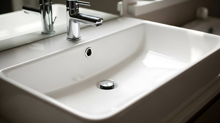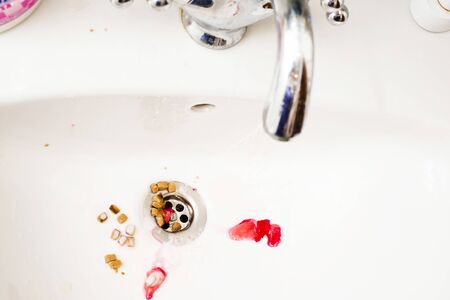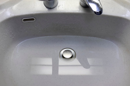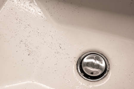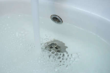 Slow bathroom sink drain. Household plumbing problem. Water draining down slowly in wash basin. Drain cleaning and unclog