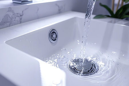 A stream of clean water flows into the drain hole of a white sink with a shallow depth of field