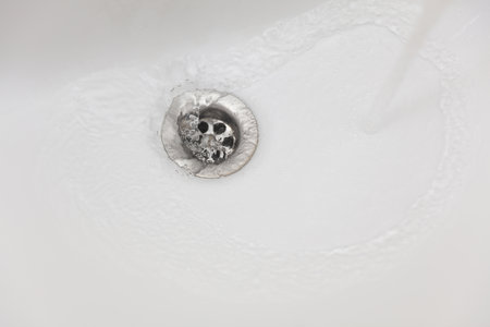 Water swirling down into a drain in bathroom sink. Concept of hygiene, cleaning, sanitation and plumbing. Drainage system and wash basin maintenance.
