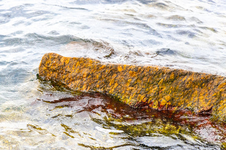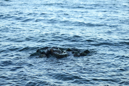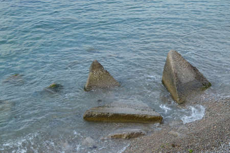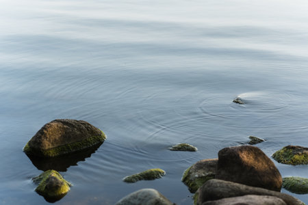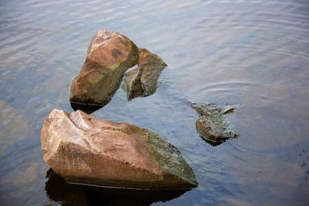 Boulders and rocks on sea shore washed with waves and causing ripples on water surface