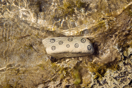 white rectangular stone with sad and happy faces painted on it under clear sea water. sun glare hello summer, vacation, travel. the choice of mood is in your hands, be positive