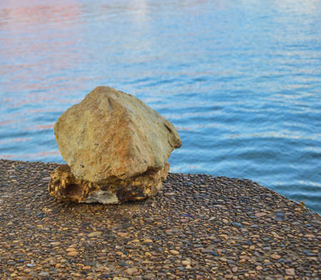 Natural stones on the shore of a lake at dusk. Tranquil scene, relaxing calm, zen meditation background.