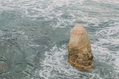 A stone pyramid protruding from the water, the view of the blue sea with small waves.