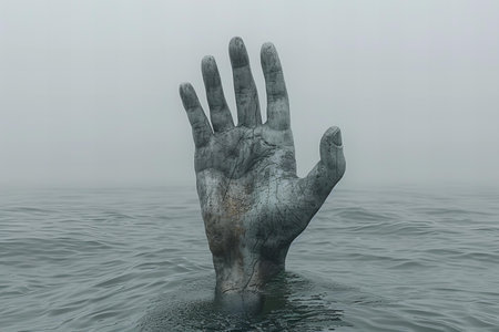 Human hand drowning in the water on a foggy day with copy space