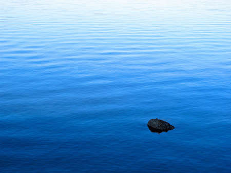 Lone stone sticks out of blue waters against the background of the horizon