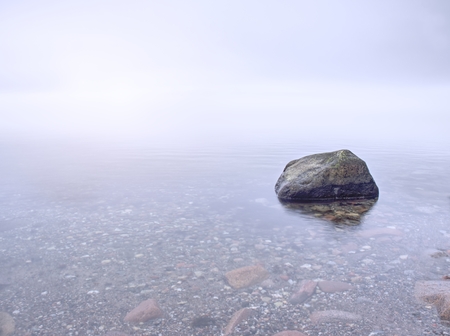Alone stone in smooth sea. Beautiful seascape with low lightt. Sea and rock at the sunset. Nature composition. Long exposure photography.