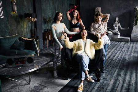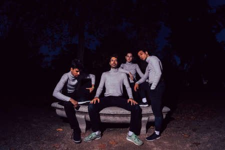 Full length portrait of flashy dance crew posing in dark studio with male Asian leader