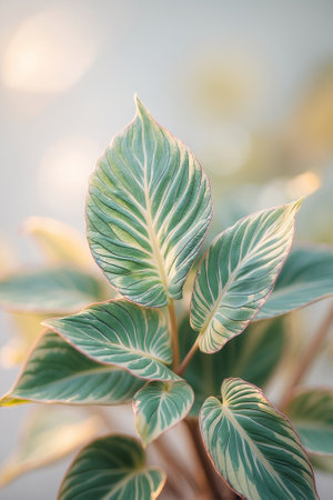 Close-up view of vibrant green leaves with striking patterns during soft sunlight in a calming indoor setting