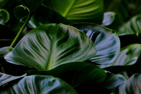 Selective focus closed up tropical summer green leaf dark tone background