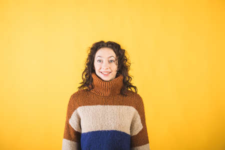 Beautiful young hipster girl in a striped sweater on a yellow background