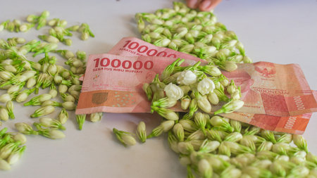 money one hundred rupiahs on pile of buds of fresh green jasmine flower buds. Suitable for business on jasmine flower illustration.