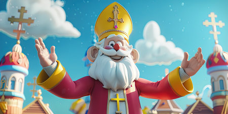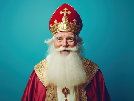 A joyful Sinterklaas with a long white beard, wearing a red mitre and ornate bishop's robe with gold trim, standing against a vibrant blue background.