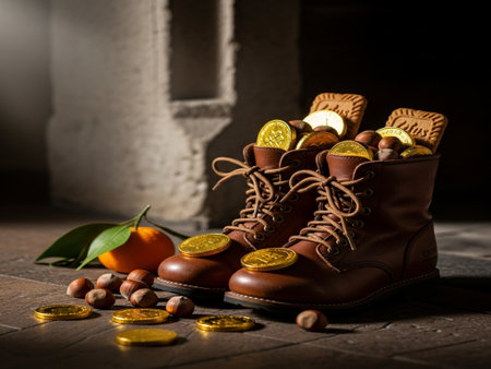 Sinterklaas holiday wooden shoes with treats for Saint Nicholas Day, copy space, AI generated