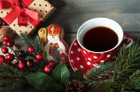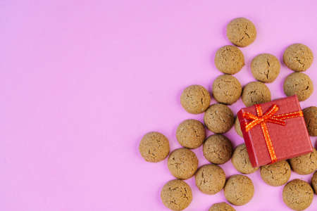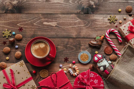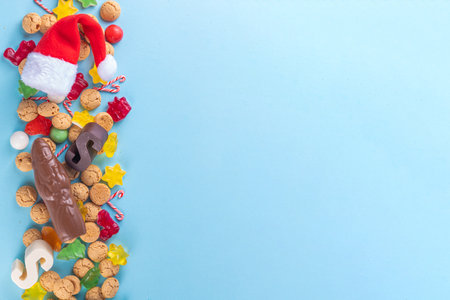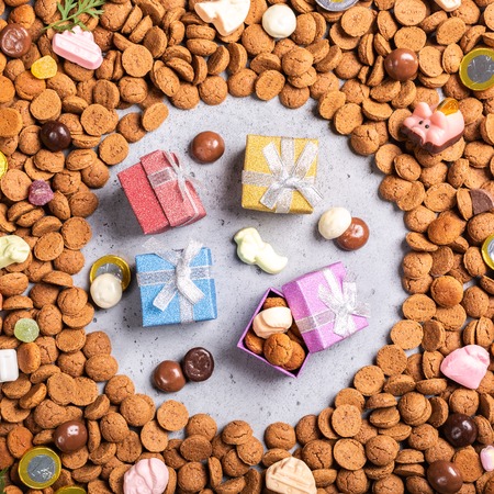 St. Nicholas Day background. Card. Dutch holiday Sinterklaas flat lay with gifts, pepernoten, traditional sweets strooigoed. Holiday greeting card . Copy space
