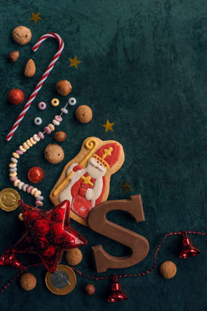 Dutch holiday Sinterklaas background with traditional sweets and chocolate letter.