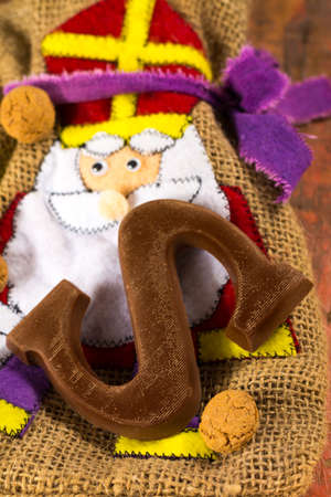 Traditional Dutch Saint Nicolas celebration with presents for children in December, Saint Nicolas gift bag and chocolate letters close up