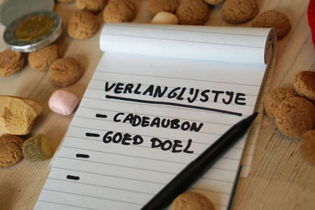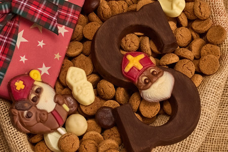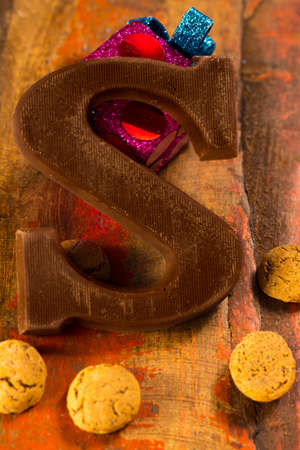 Traditional Dutch Saint Nicolas celebration with presents for children in December, Saint Nicolas chocolate letters and spicy cookies close up