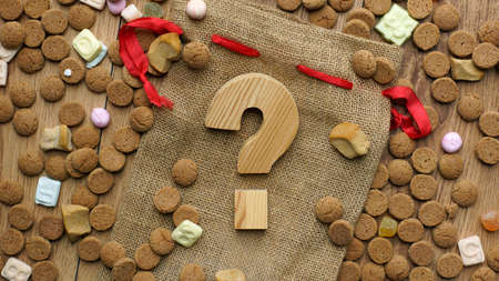 Wooden question mark between ginger nuts and candy's for the Dutch Santa-Claus celebration of the 5th of December