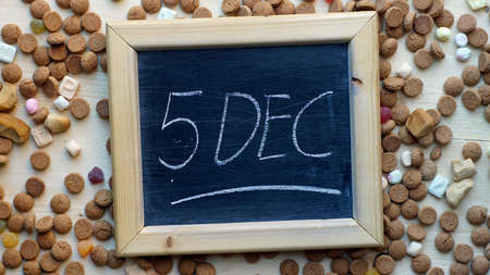 5th december in Dutch written on a chalkboard between ginger nuts and candy's for the Dutch Santa-Claus celebration of the 5th of December