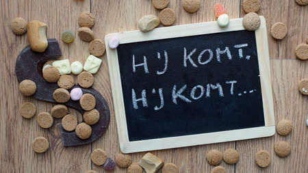Santa Claus is coming in Dutch written on a chalkboard for the Dutch Santa-Claus