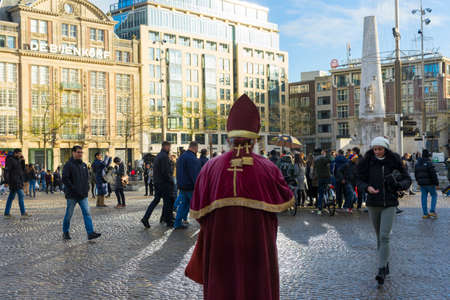 Street performer dressed as a priest perform on Dam Square in morning sunrise in Amsterdam, Netherlands