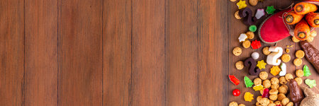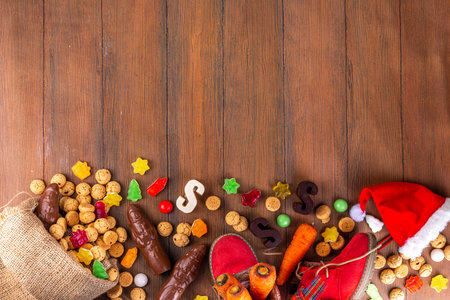 Traditional winter Netherlands, Belgium, Luxembourg, Dutch, North of France holiday. Saint Nicholas Sinterklaas kids day background with Strooigoed, pepernoten sweets, carrots, sneakers copy space