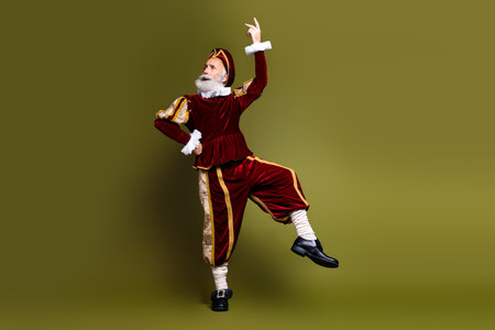 Mature man in royal costume posing in a historical outfit against a khaki background, exploring a nostalgic theme