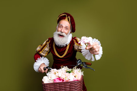 Bearded Man Dressed as a Renaissance Nobleman Holding Flowers with a Classic Bicycle