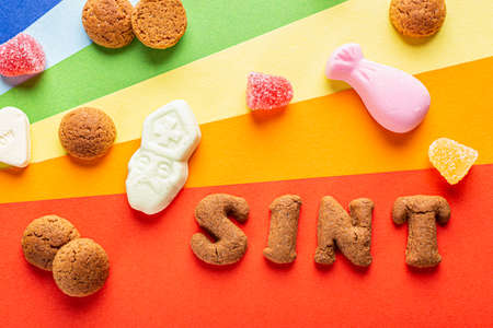Dutch holiday St Nicholas day, Sinterklaas concept with letters, traditional sweets and cookies, kruidnoten on rainbow background with copy space. Top view, overhead.