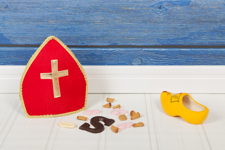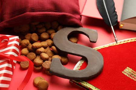 Saint Nicholas (Sinterklaas) day. Miter, book, feather, kruidnoten cookies, chocolate letter S and gift box on red background, closeup
