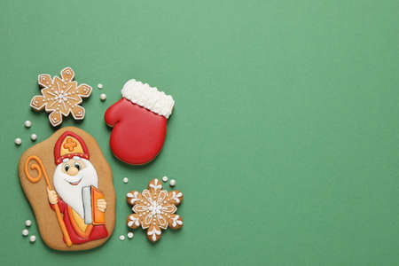 Tasty gingerbread cookies on green background, flat lay with space for text. St. Nicholas Day celebration