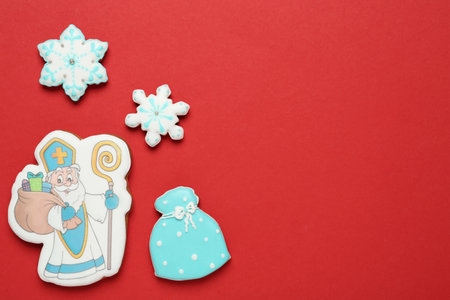 Tasty gingerbread cookies on red background, flat lay with space for text. St. Nicholas Day celebration