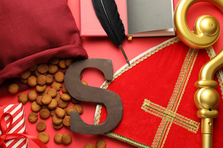 Saint Nicholas (Sinterklaas) day. Miter, crosier, book, feather, kruidnoten cookies, chocolate letter S and gift box on red background, flat lay