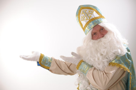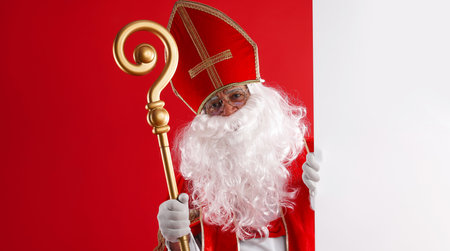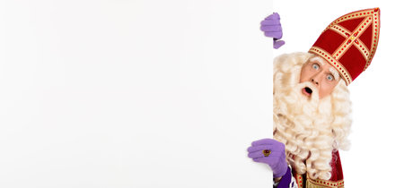 Sinterklaas or saint Nicholas holding blank cardboard. isolated on white background. Dutch character of Santa Claus