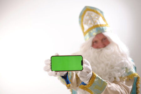 white rich beard and golden blue suit of St. Nicholas in hands with a phone and a green screen for advertising and text Dutch Santa Claus St Nicholas christmas new year