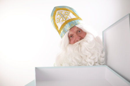 New Year is coming Saint Nicholas opened a large blue box, it is empty, there is a gift in it Sinterklaas portrait USA on a white background. Dutch Santa Claus St Nicholas christmas new year