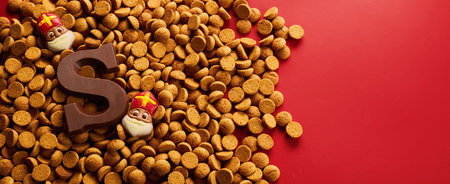 Saint Nicholas (Sinterklaas) day. Chocolate letter S and kruidnoten cookies on red background, flat lay