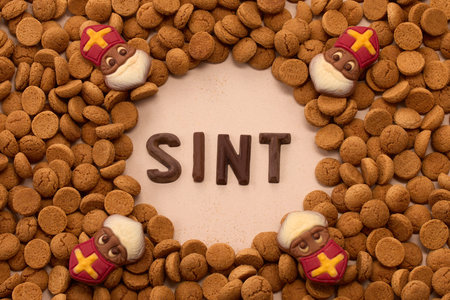 Celebration of Saint Nicholas, patron saint of children in Netherlands, Belgium, Luxembourg and North of France in first week of December, chocolate letters S and names of Sint and Piet close up
